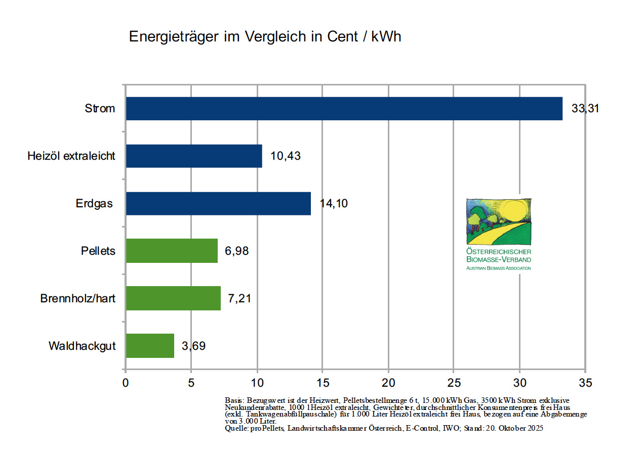 Im Vergleich mit dem Oktober 2024 sank der Preis für Heizöl um gut 4 % und verzeichnete gegenüber dem Vorjahresmonat den größten prozentualen Rückgang. Der Gaspreis gab gegenüber dem Vorjahresmonat um rund 0,7 % nach und der Pelletspreis stieg im Vergleich zum Vorjahresmonat um rund 15 %. Der Scheitholzpreis stieg im Jahresvergleich um rund 1,1 % und ist im Oktober 2025 verglichen mit Heizöl um rund 31 % und im Vergleich mit Erdgas um rund 49 % günstiger. Der Preis für Waldhackgut verzeichnete gegenüber dem Vorjahresmonat einen Rückgang um rund 3,4 % und der Preisvorteil gegenüber Heizöl beträgt aktuell rund 65 % und gegenüber Erdgas sogar über 73 %.