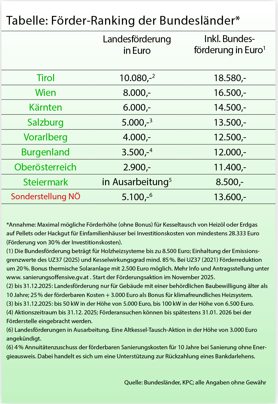 Die Sanierungsoffensive 2026 mit den zentralen Förderungsschwerpunkten Kesseltausch und Sanierungsbonus fördert Investitionen in klimafreundliche Heizsysteme und thermisch-energetische Sanierungen! Österreichweit, sowohl bei Ein- und Zweifamilienhäusern und Reihenhäusern als auch im mehrgeschoßigen Wohnbau und in Reihenhausanlagen. Sie bietet eine attraktive Möglichkeit, Heizsysteme klimafreundlich zu modernisieren sowie Gebäude thermisch-energetisch zu verbessern. Lieferungen und Leistungen für den Kesseltausch werden ab 03.10.2025 gefördert. Bitte beachten Sie dazu die entsprechenden Informationsblätter.